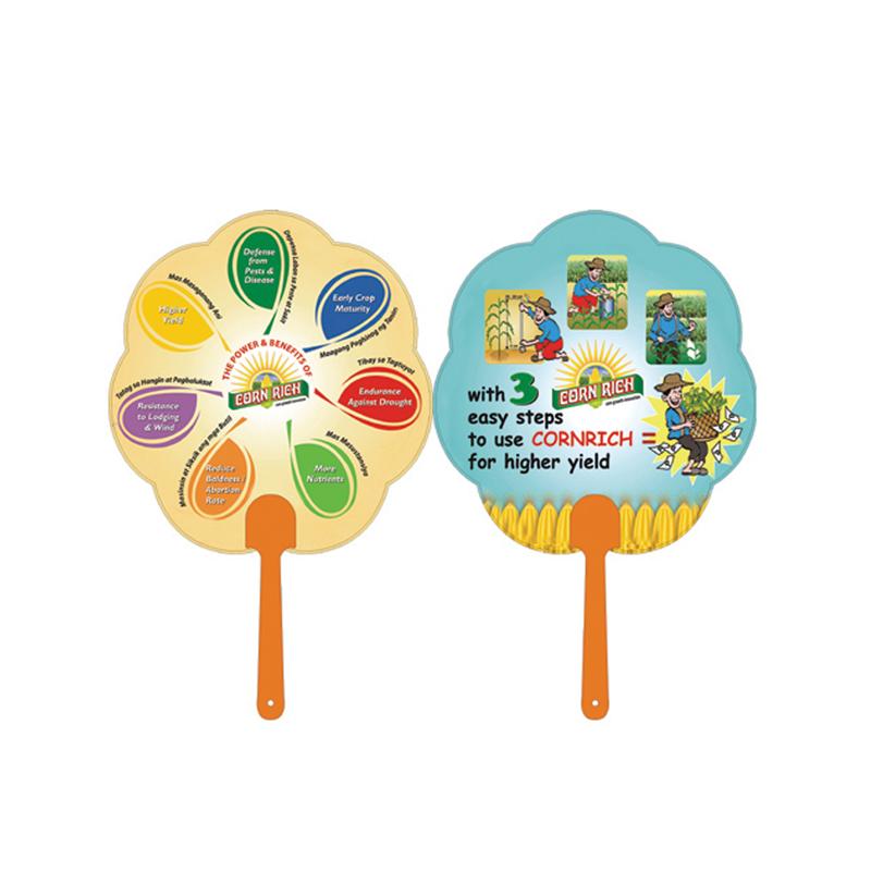 采用PP片材料印刷+扇柄制作而成,可根據(jù)客戶要求制作不同形狀及大小,價格優(yōu)惠,促銷效果顯著,不過時。不變質(zhì)。