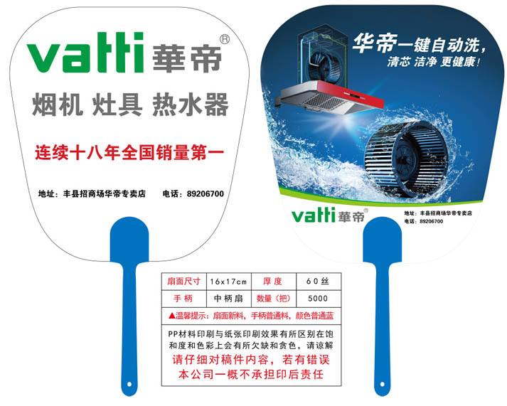 本產(chǎn)品采用60絲PP塑料片彩色印刷作而成,有透明材料和不透明材料的塑料片,有銅版紙印刷材料。扇面通用外形:方形、圓形、桃心形、橢圓、異形等多種選擇扇柄可以做:O型、中柄、長(zhǎng)柄、折扇等多種扇柄選擇,歡迎來(lái)電來(lái)函咨詢及訂購(gòu)。
