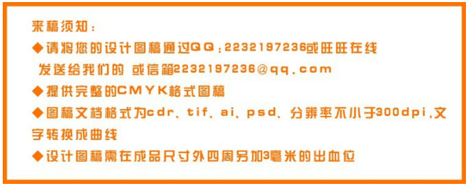 答:客戶有圖稿,直接發(fā)PS/CDR/CDR文件給我們。如果沒有,請?zhí)峁﹫D文,我們可以免費排版設(shè)計。